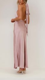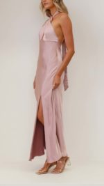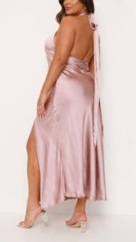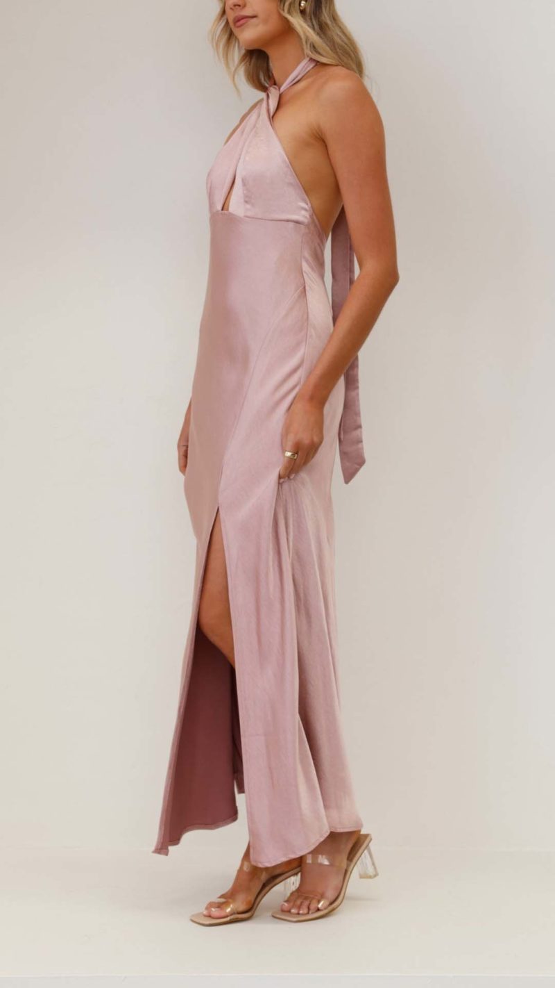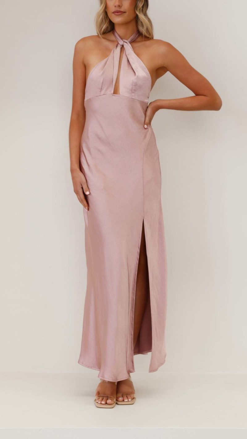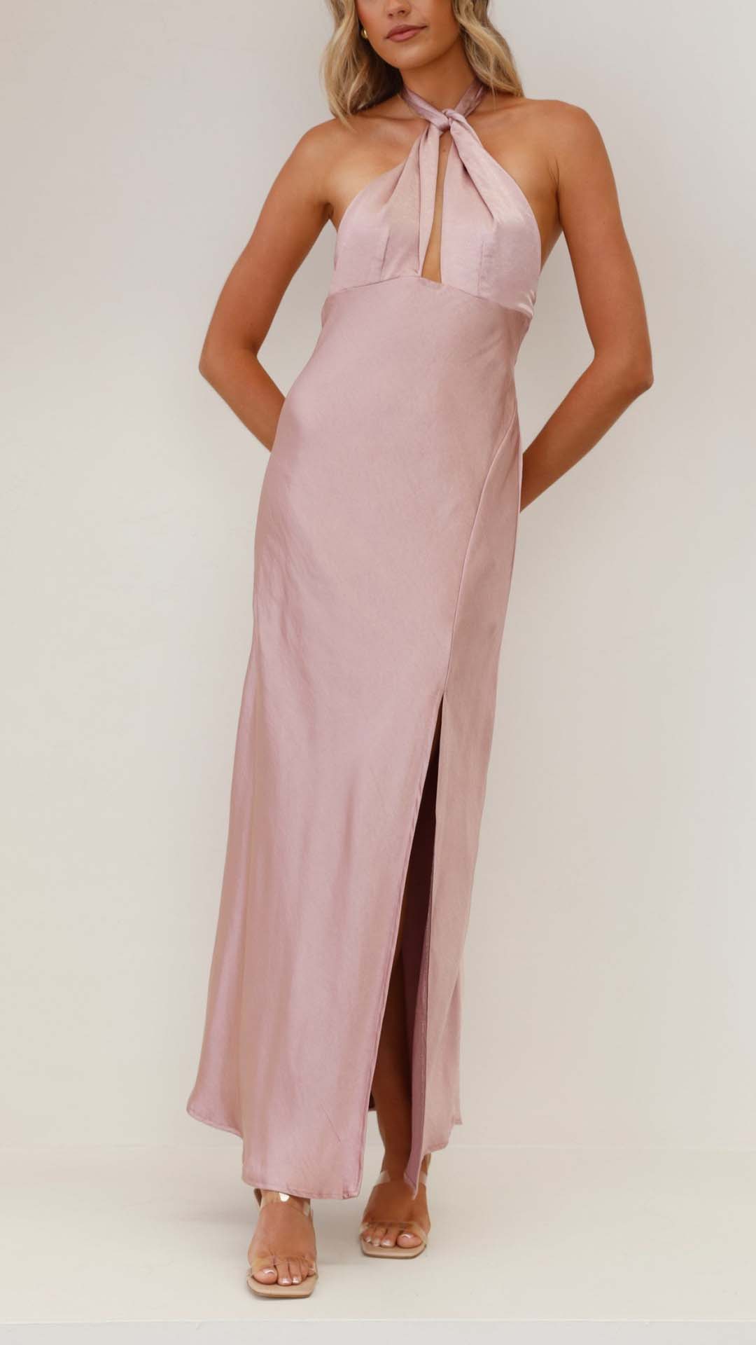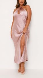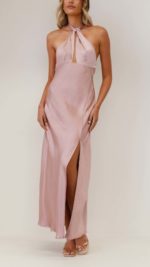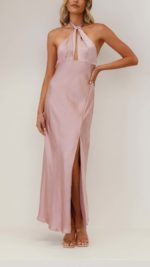 Elevate your style with this elegant pink satin maxi dress. Featuring a halter neckline with cutout detail, an adjustable tie back, and a sultry side slit, this dress combines sophistication and allure. Perfect for any special occasion, it ensures a flattering fit with its enclosed back zipper.