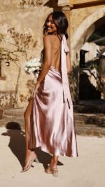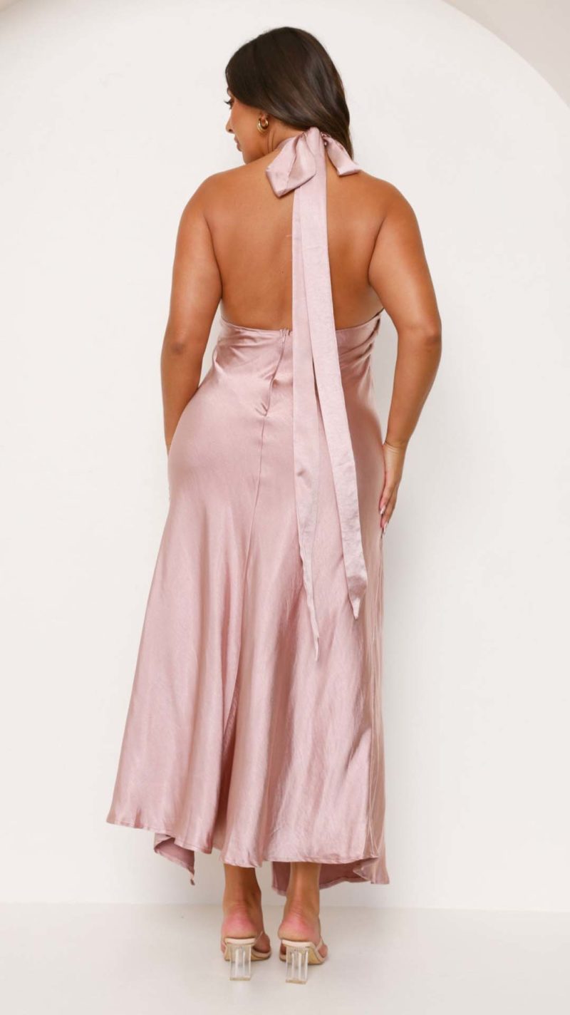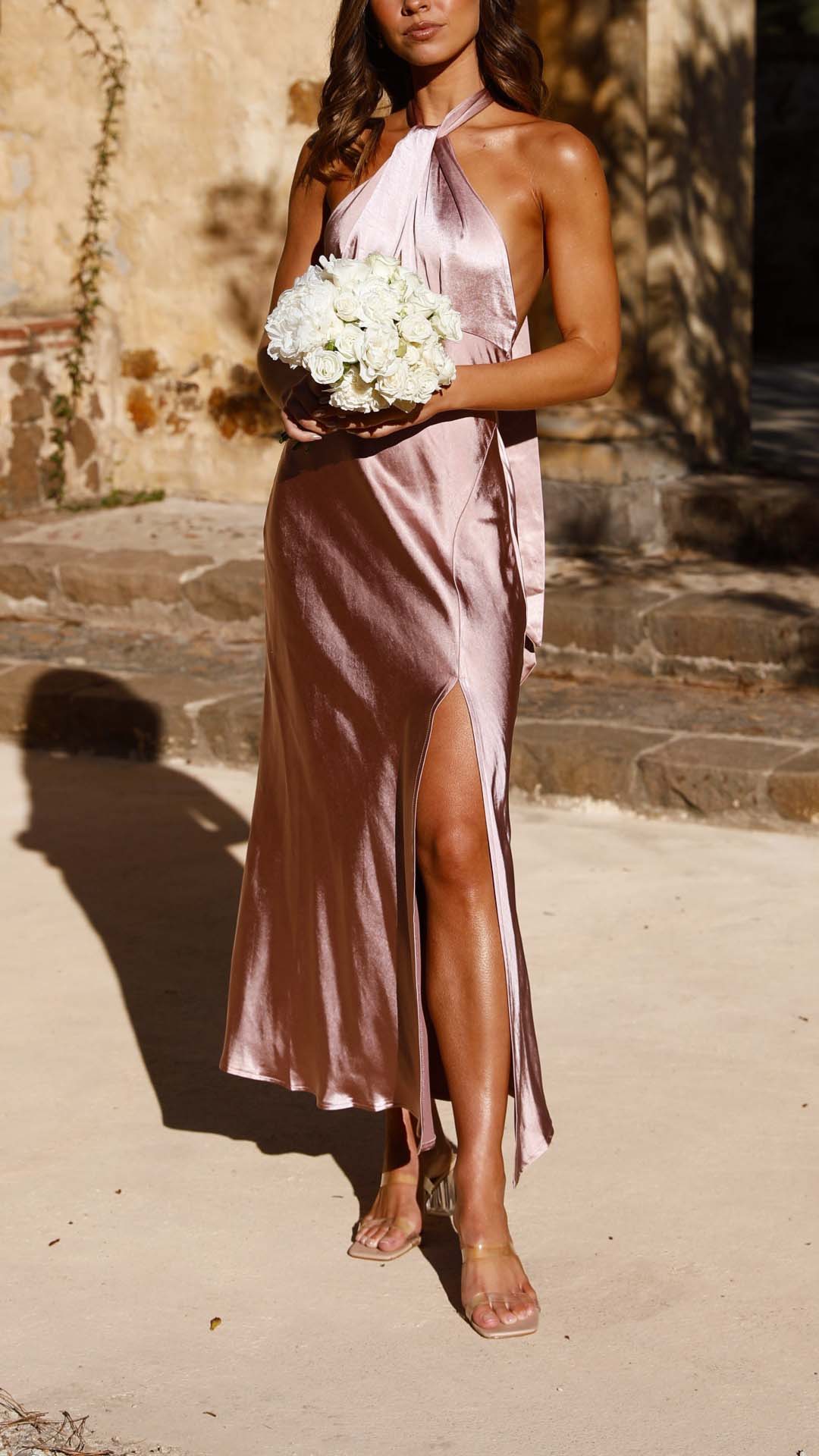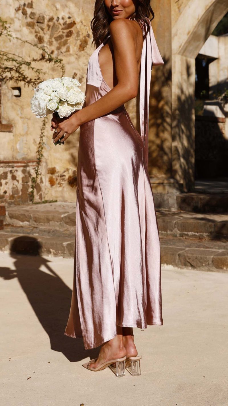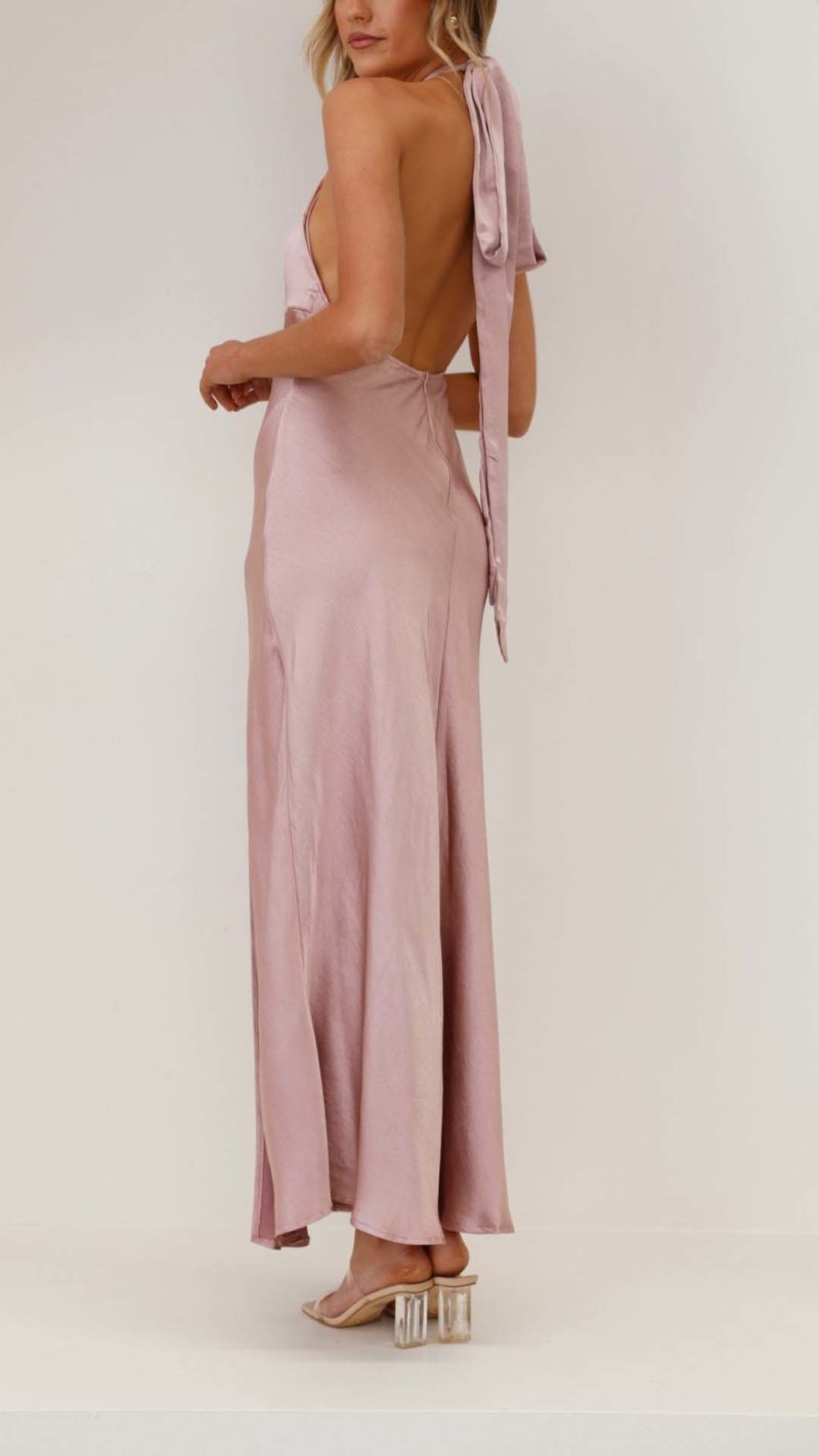 Elevate your style with this elegant pink satin maxi dress. Featuring a halter neckline with cutout detail, an adjustable tie back, and a sultry side slit, this dress combines sophistication and allure. Perfect for any special occasion, it ensures a flattering fit with its enclosed back zipper.