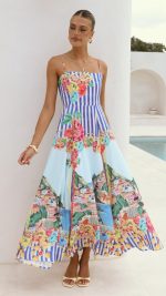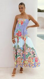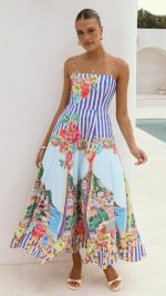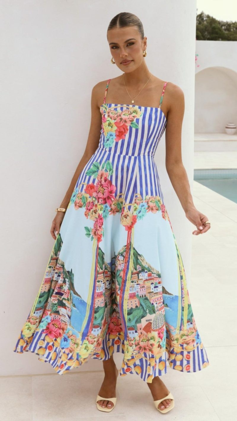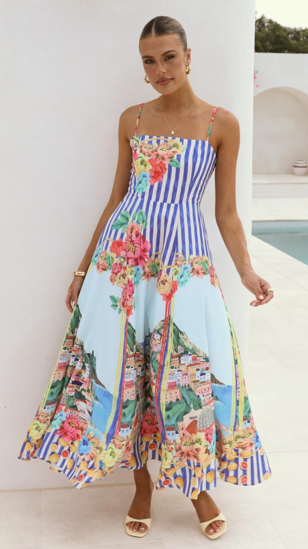 Design Note — Vertical stripes and a vibrant Positano print define this cotton-linen maxi, elongating the frame through a fitted, square-neck silhouette. The breathable weave offers structured cool, supported by a shirred back for a flexible, tailored fit.