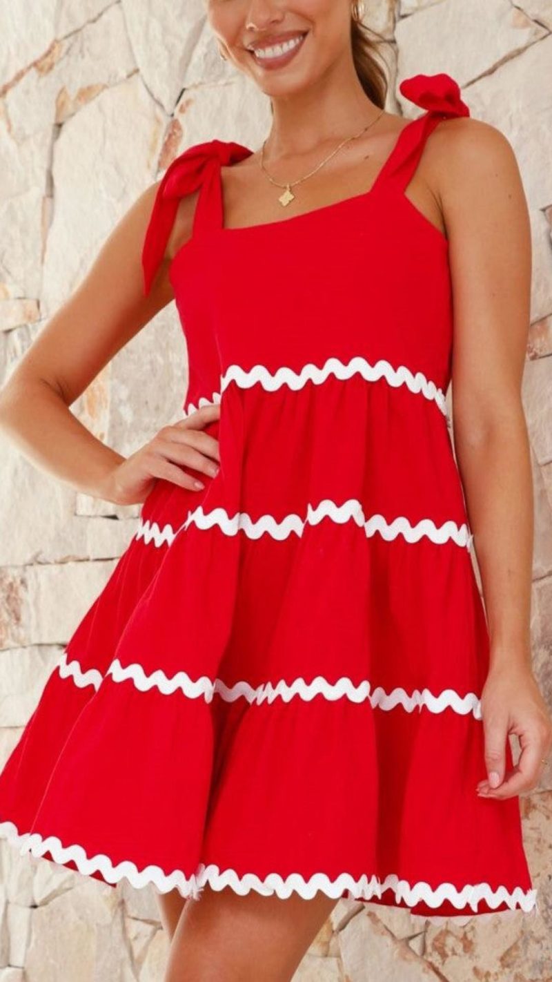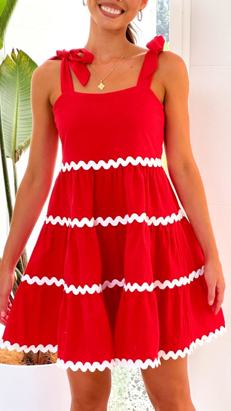 This playful mini dress features charming ric rac detailing and adjustable tie straps for a perfect fit. Its relaxed silhouette is both comfortable and stylish, making it ideal for any occasion.