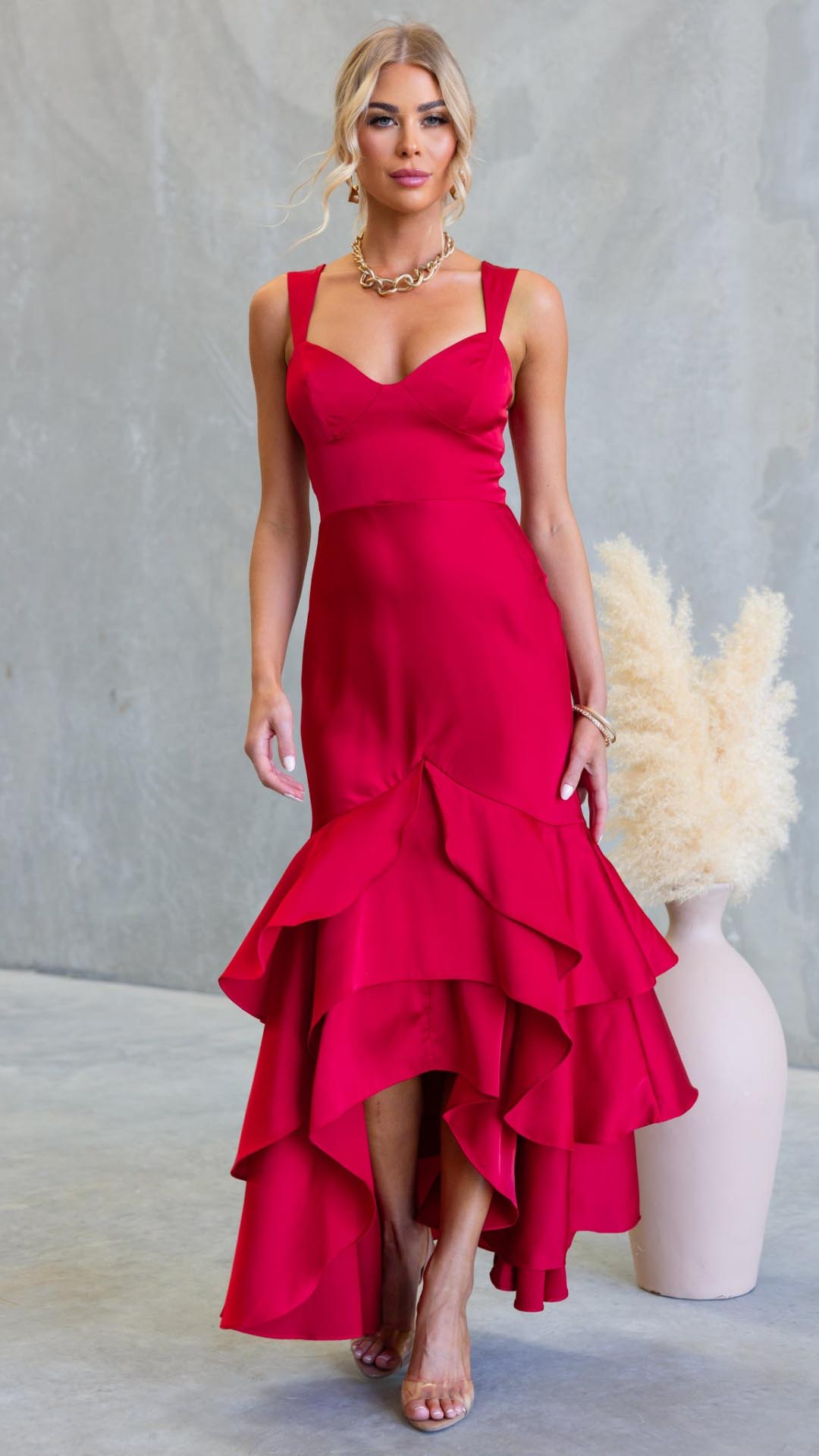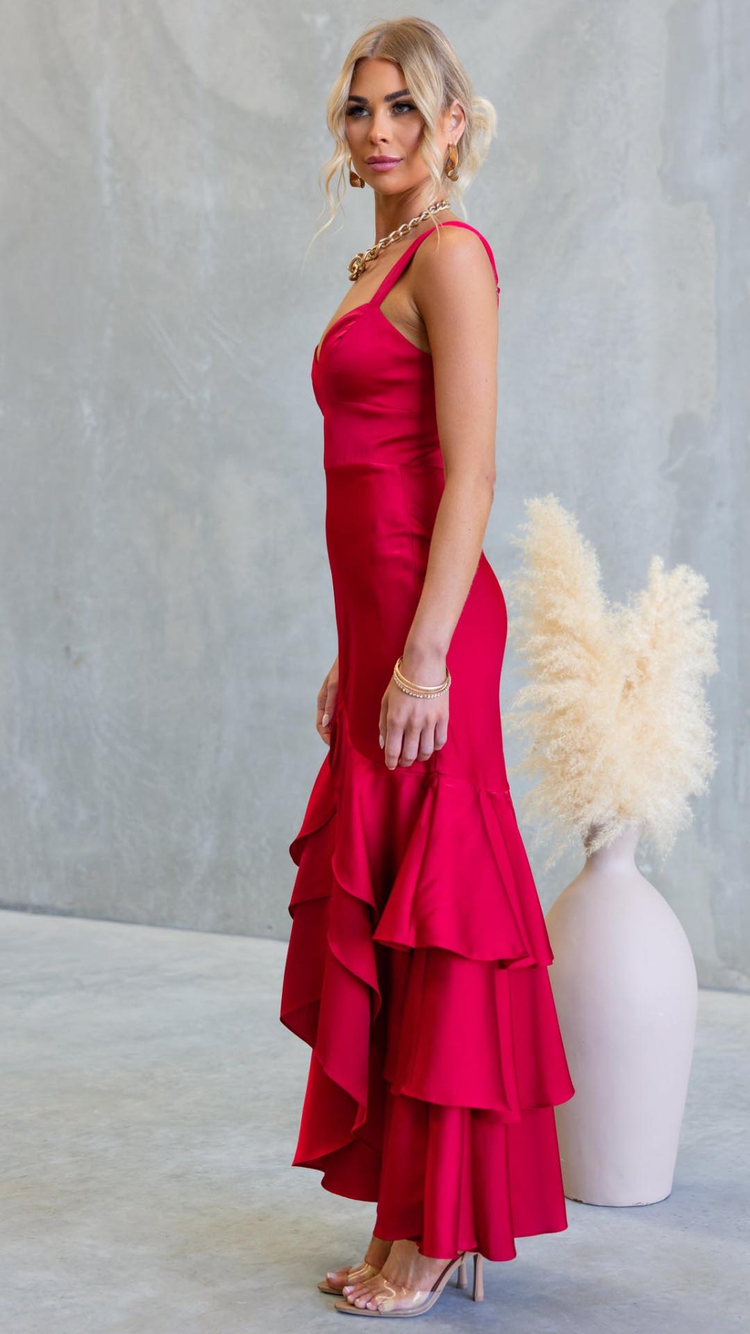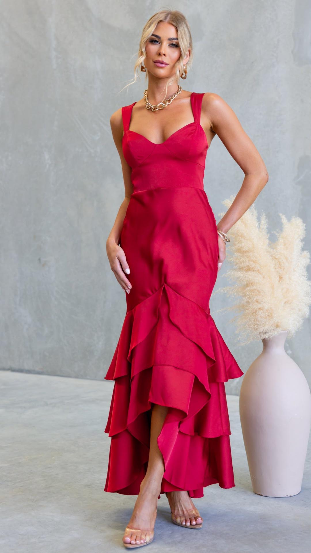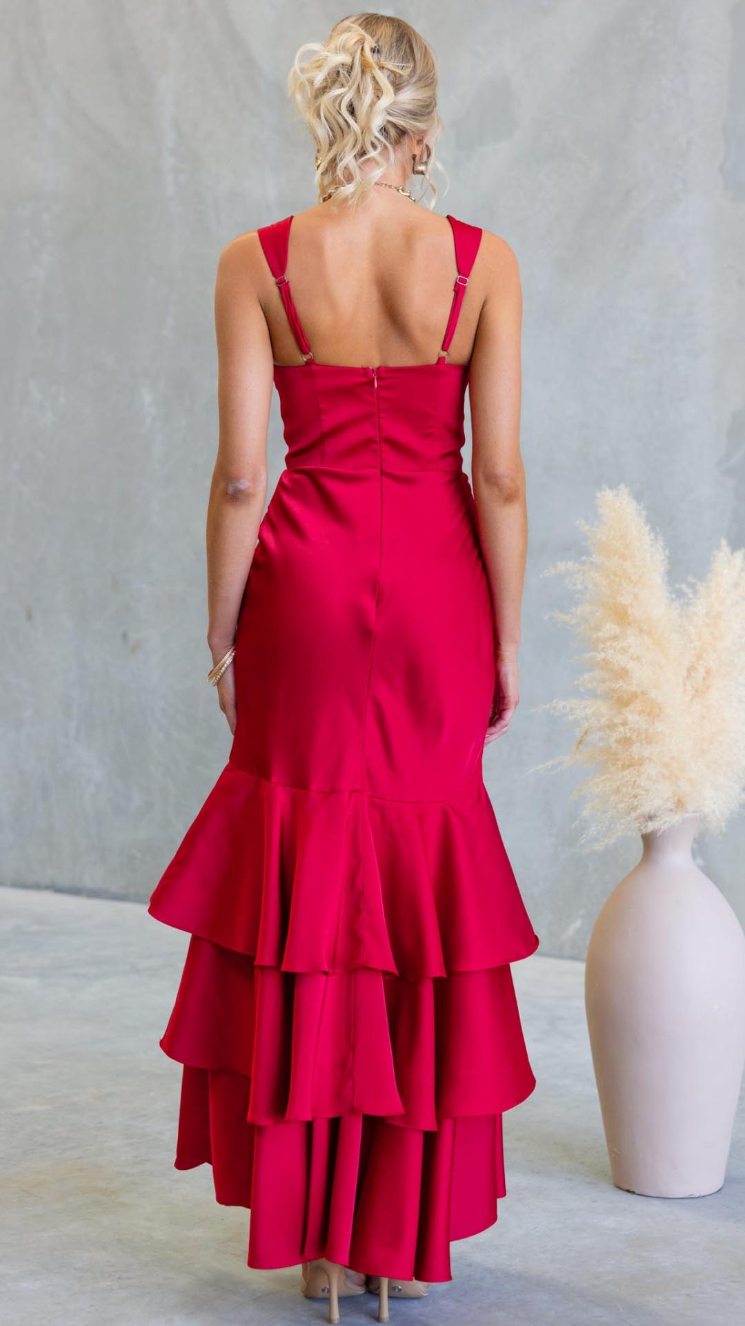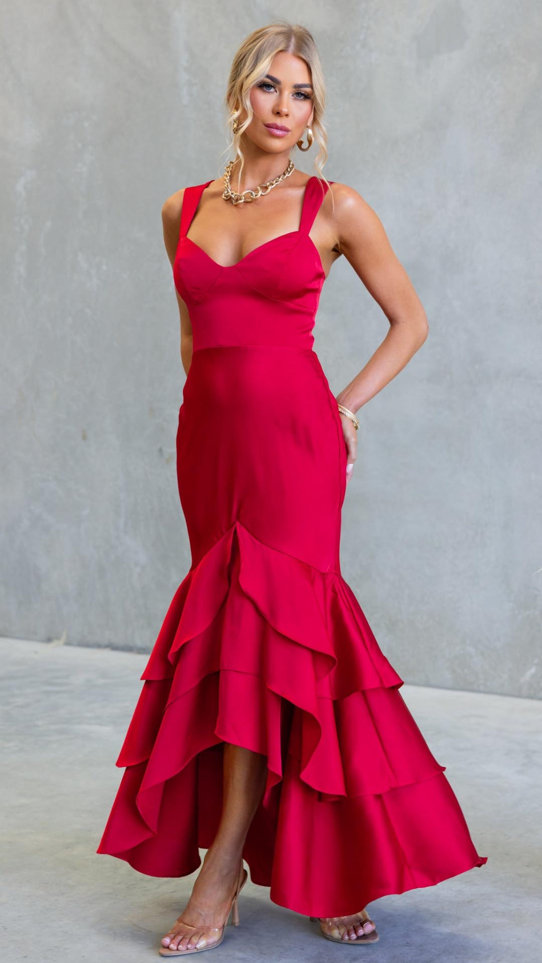 Tiered satin ruffles cascade from a sculpted hip into a sweeping high-low hem, each layer lifting and resettling with every stride. A structured bustier bodice anchors above, seamed cups and defined waist holding proportion with quiet authority.