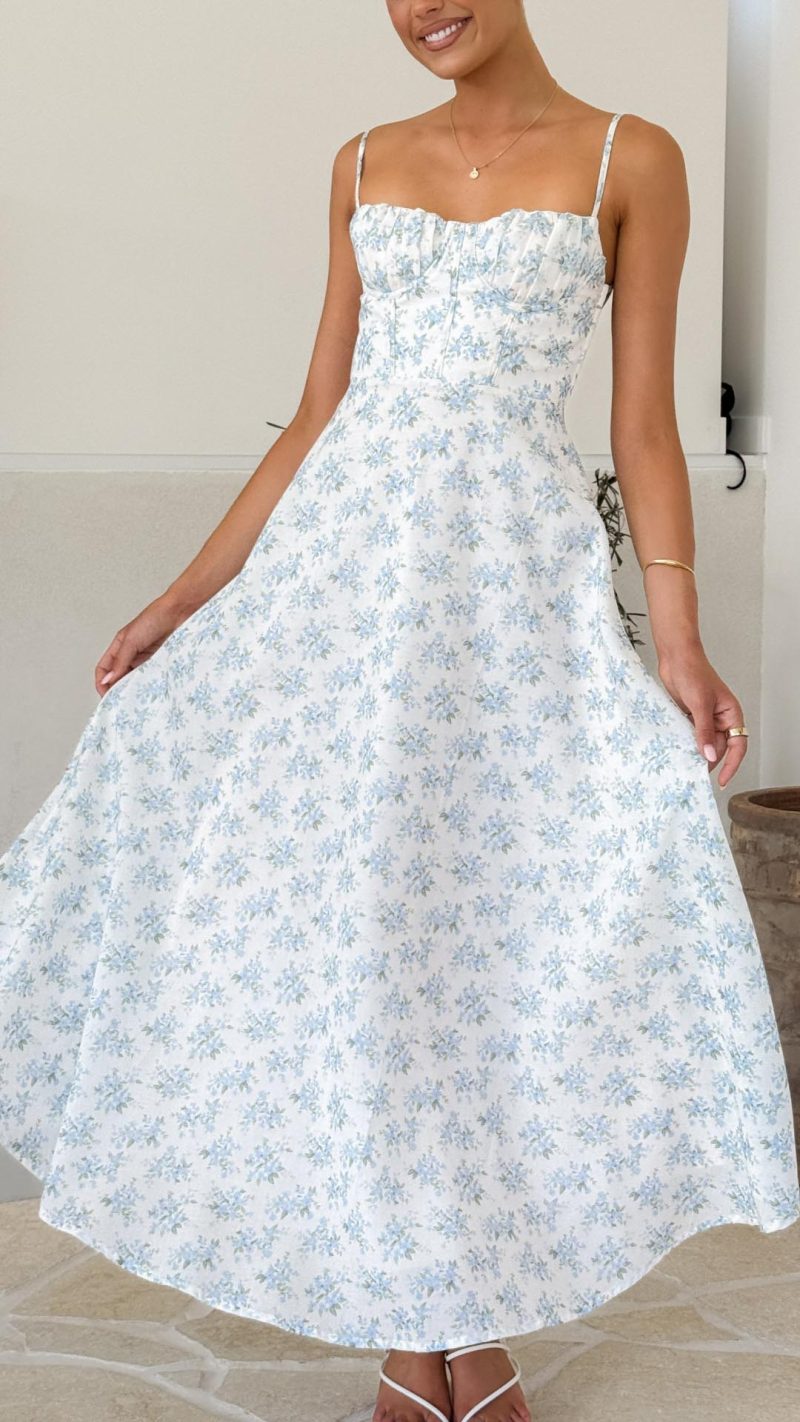 This romantic floral maxi dress features a square neckline, underwire bust, and structured waist with boning. The semi open back with tie detail adds elegance.