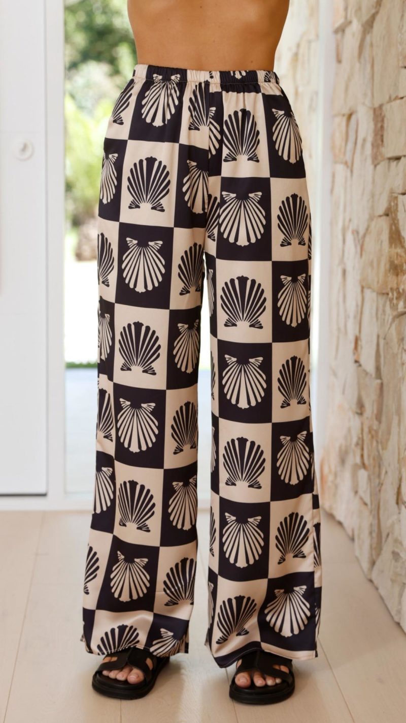 This Shell Print Relaxed Set features a chic, collared shirt with a relaxed fit and matching high-waisted, wide-leg pants. Perfect for lounging or a casual outing, this set combines style and comfort effortlessly.