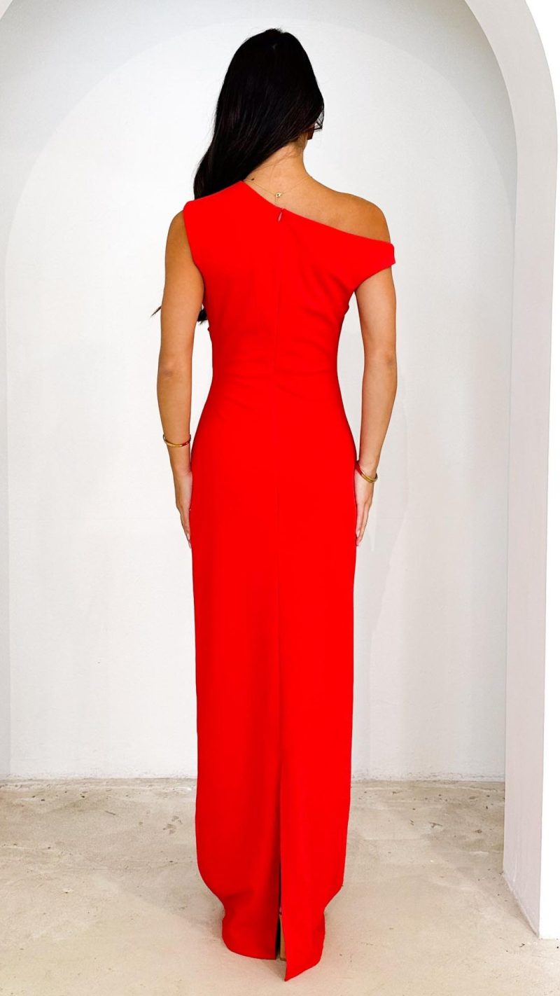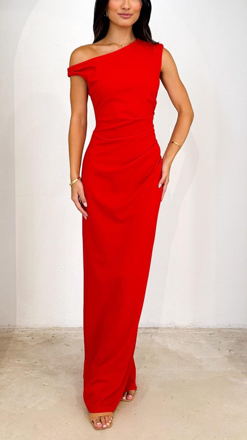 Elevate your style with this sophisticated red one-shoulder evening maxi dress. Featuring an elegant asymmetrical neckline and a sleek, fitted silhouette, this dress is perfect for formal events or galas. Its soft fabric with a slight stretch ensures both comfort and effortless glamour.