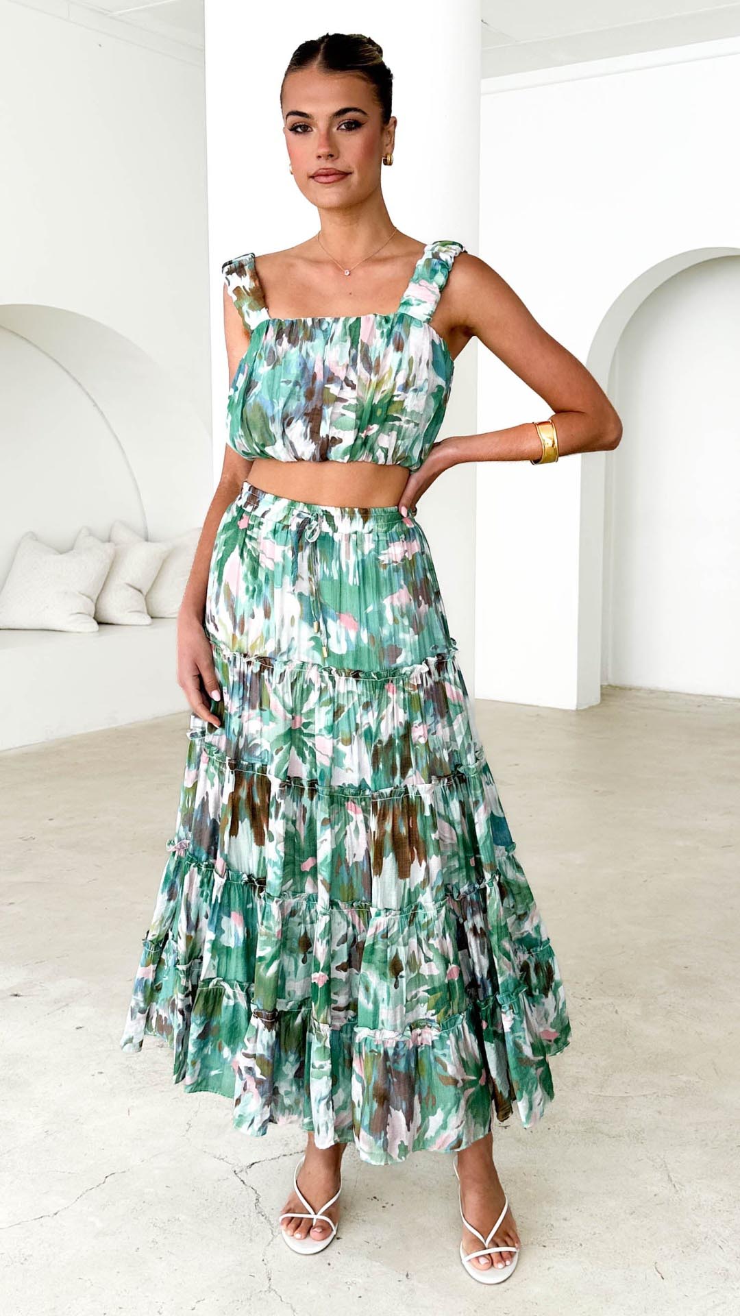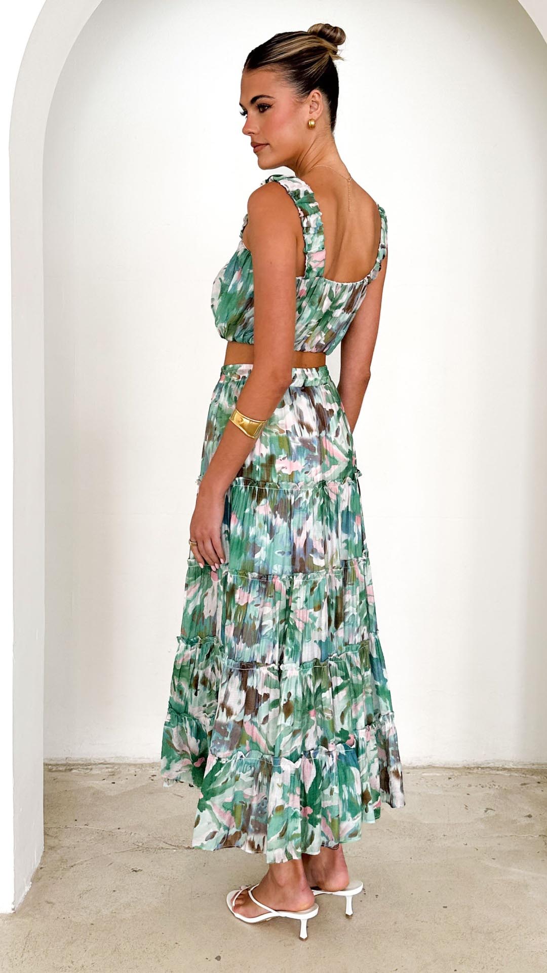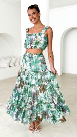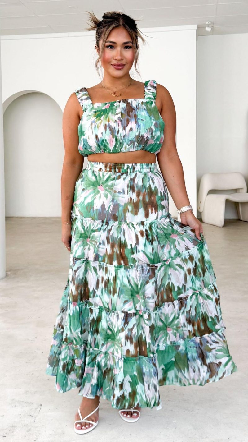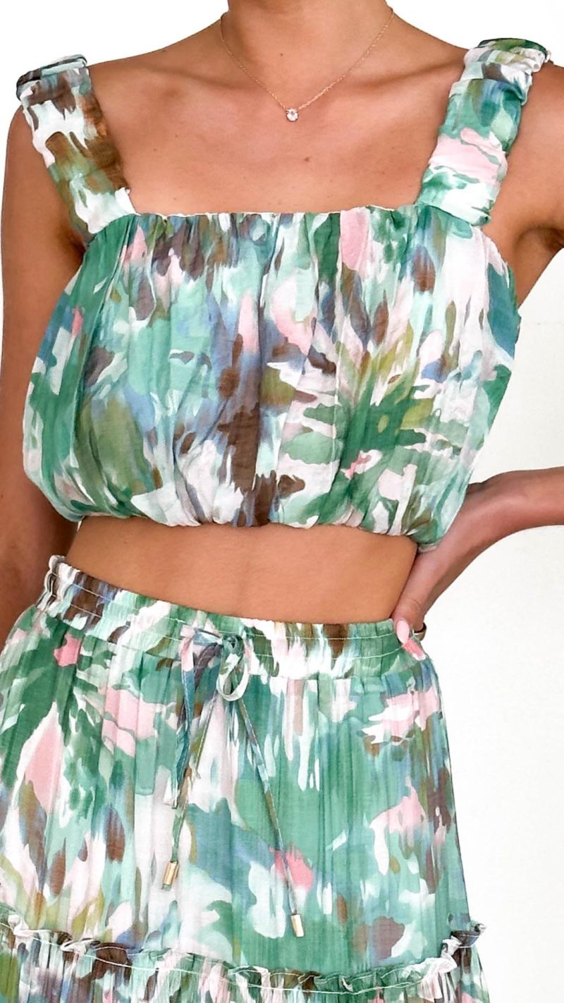Design Note — Vibrant green abstract motifs define this square-neck silhouette, detailed with soft gathering for a dimensional, breezy finish. The elasticated hem ensures a flexible fit for effortless pairing.