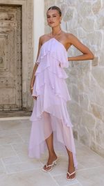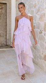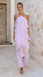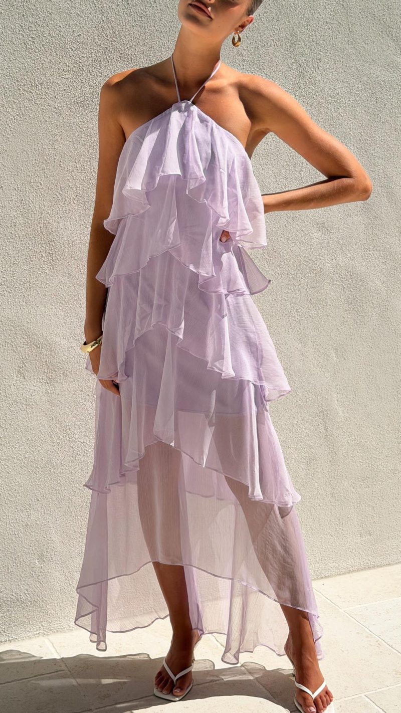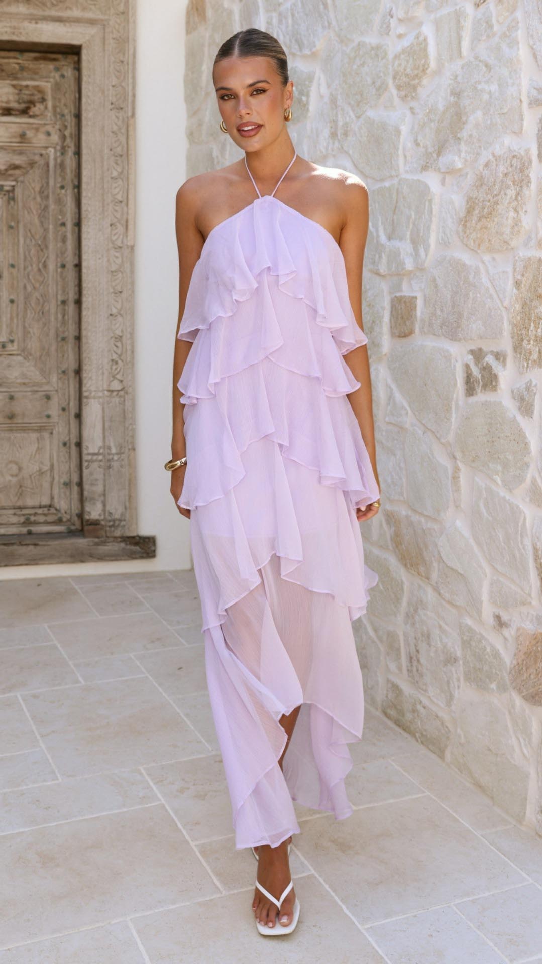 Design Note — Float through any event in this sage halter maxi, featuring soft frill layers and a flawless fit that hugs you in all the right places.
