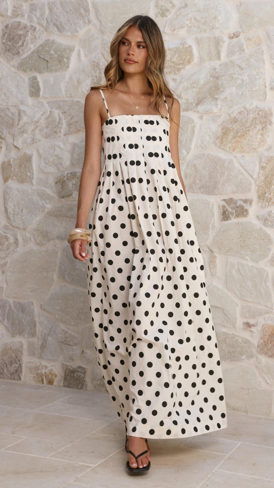 Design Note — Cut from breathable cotton, this maxi features refined bust pleating that releases into a flowing, spot-print silhouette. A flexible shirred back and adjustable straps ensure a secure, custom fit that moves effortlessly with the body.