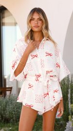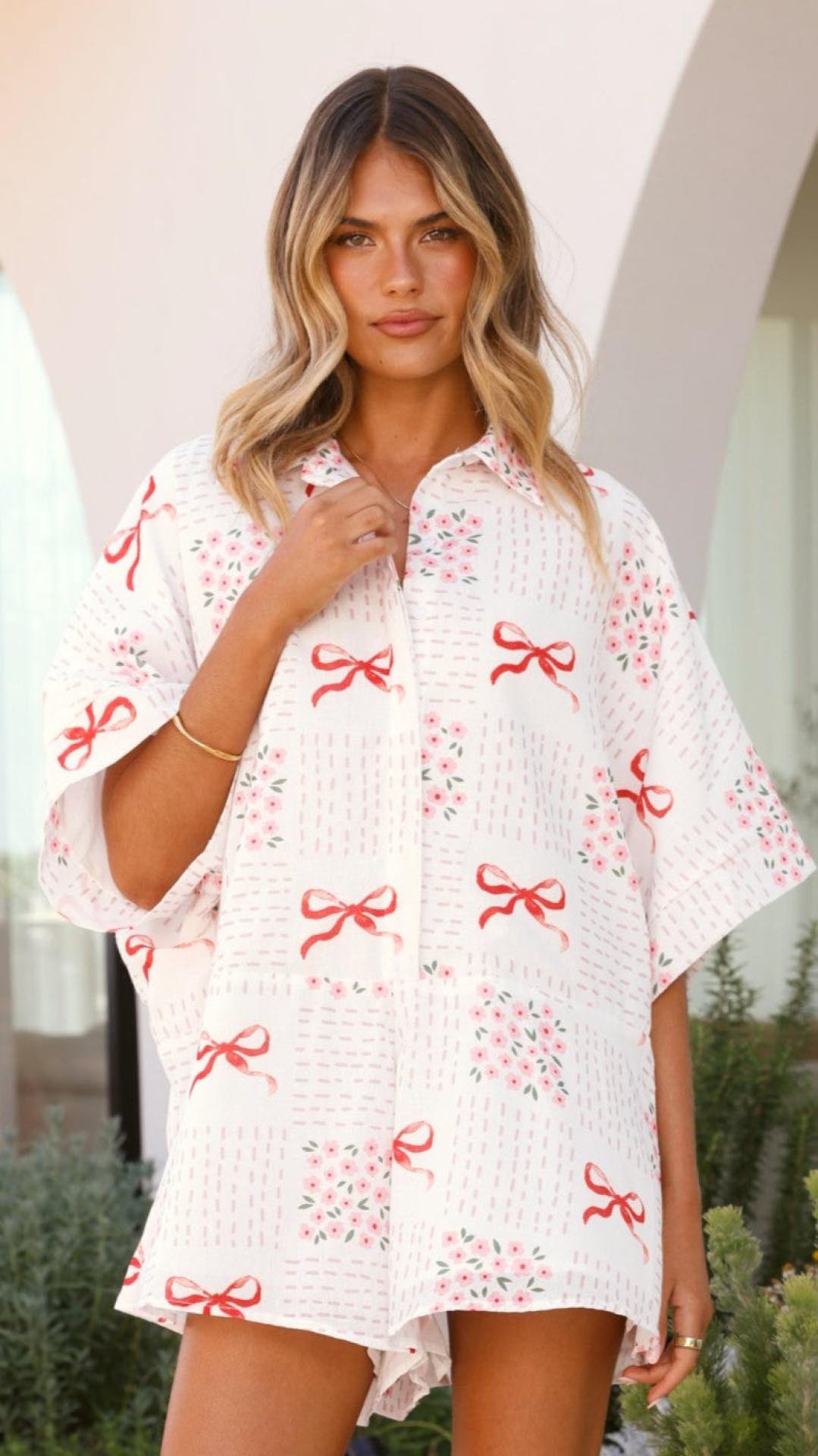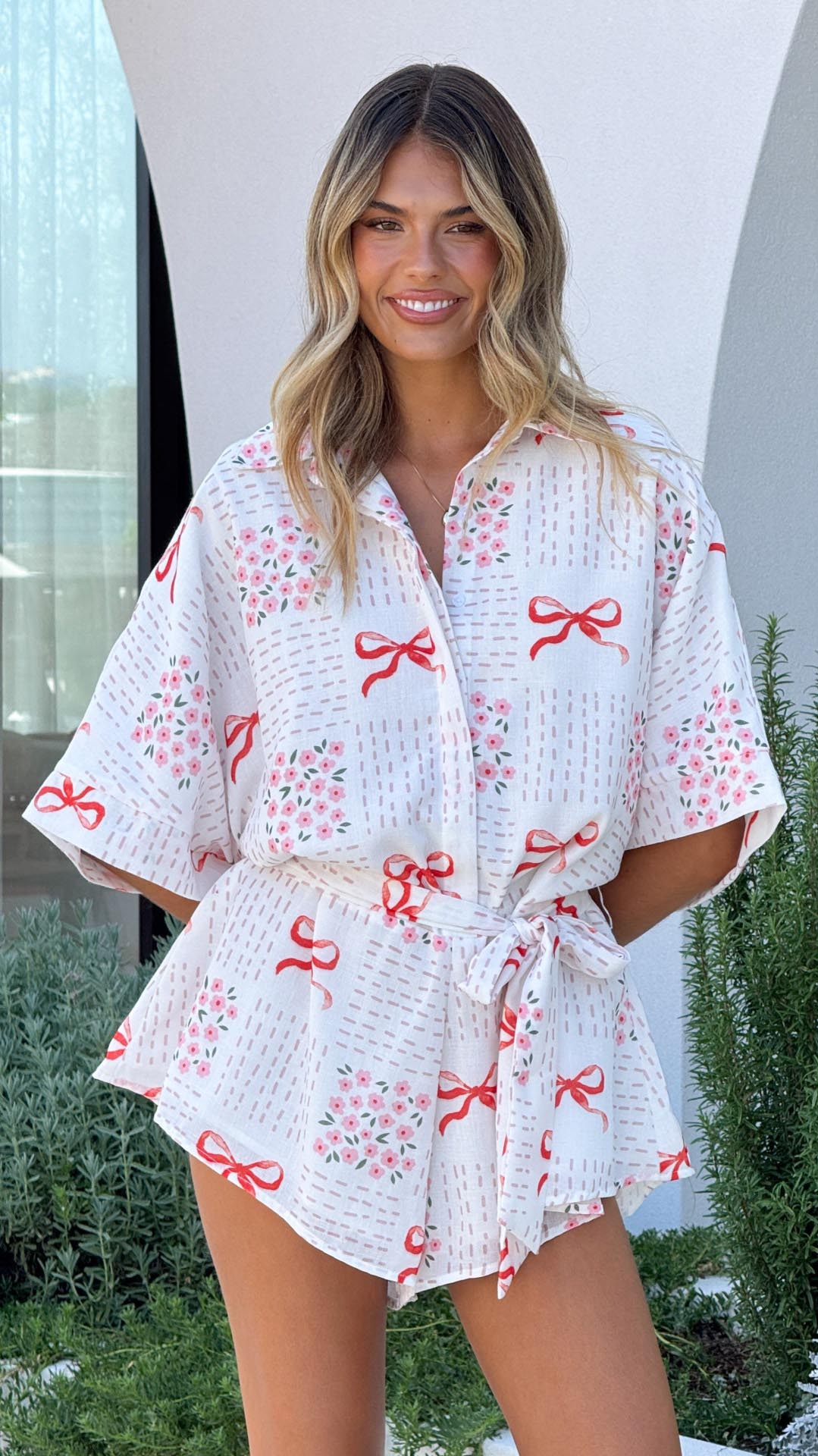 Design Note — Defined by a whimsical sweet bow print, this oversized playsuit features wide sleeves and a lightweight cotton blend for effortless movement.