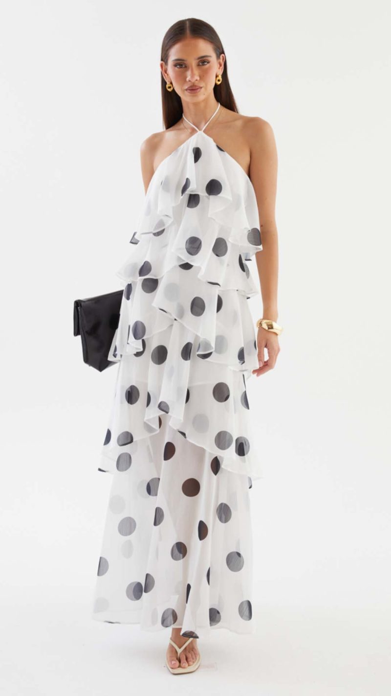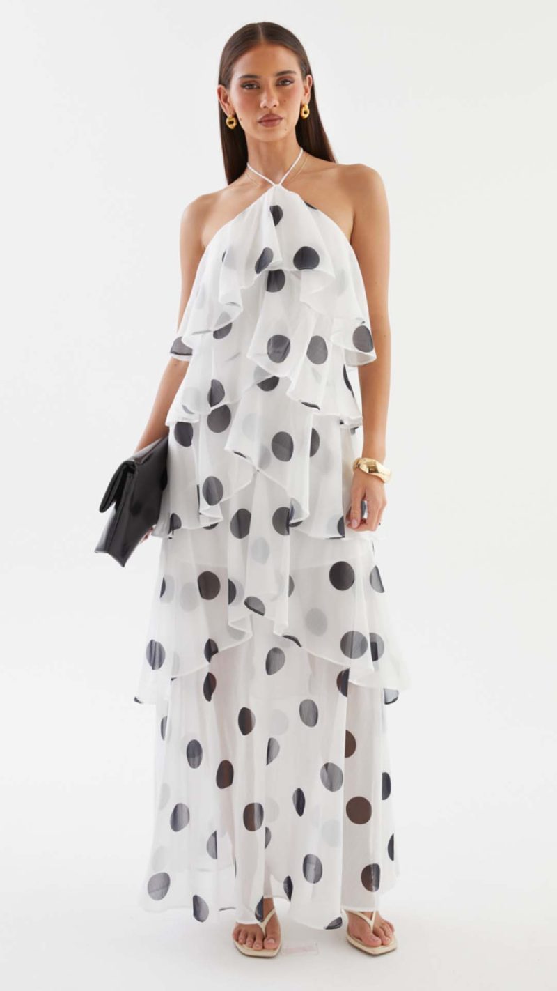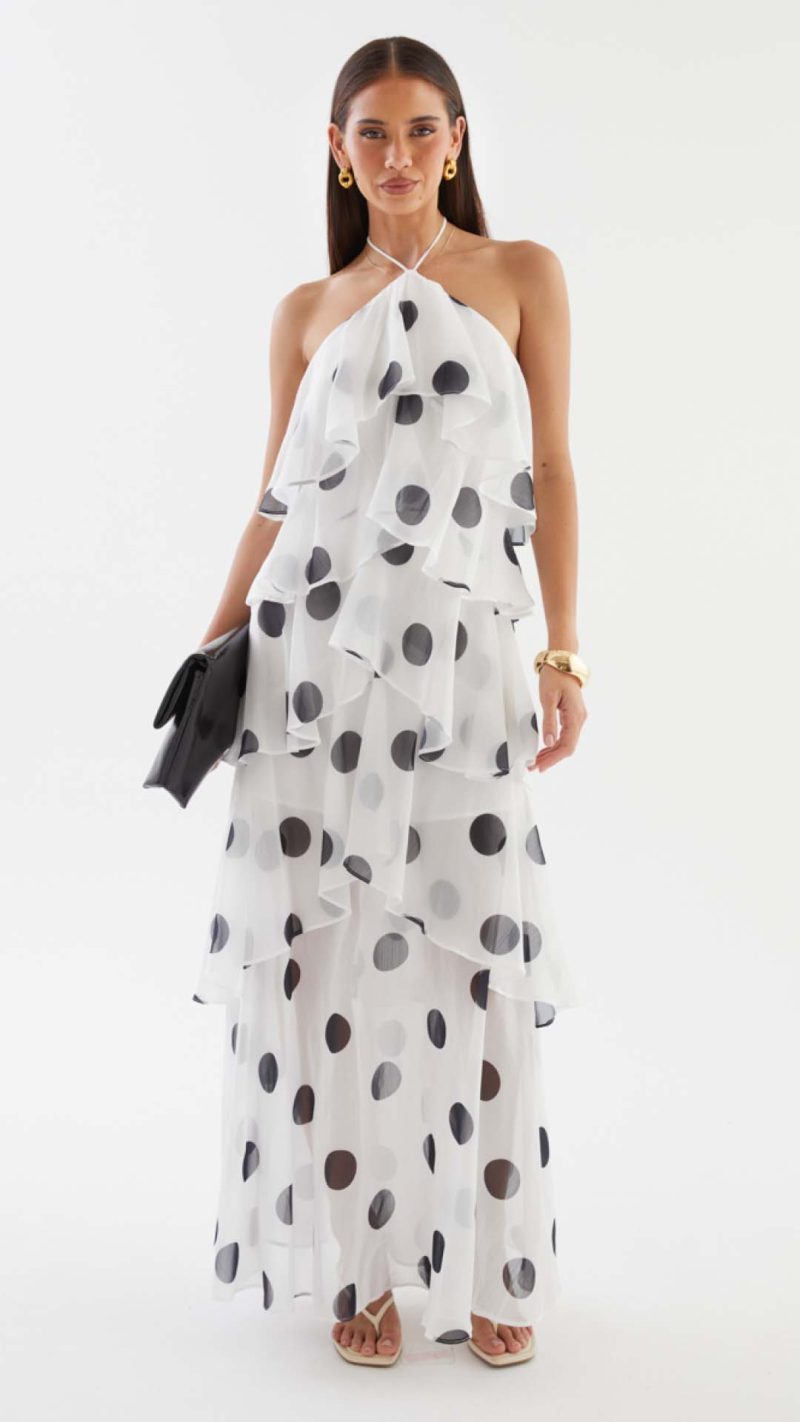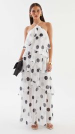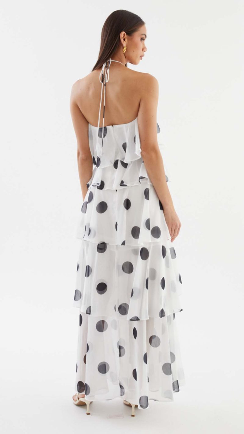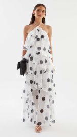Cascading chiffon flounces engineer kinetic volume, animating the polka dot motif into a dynamic display of occasion-assured presence. Beneath the sheer maxi overlay, a partial lining secures coverage while allowing the legs to read through in motion.