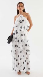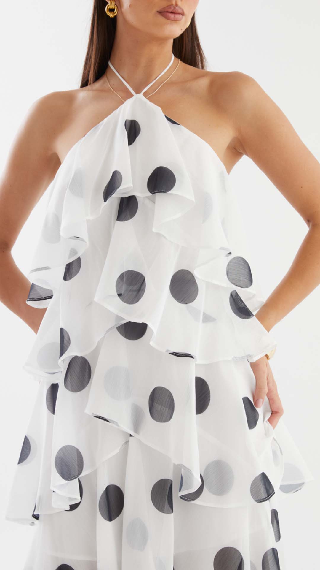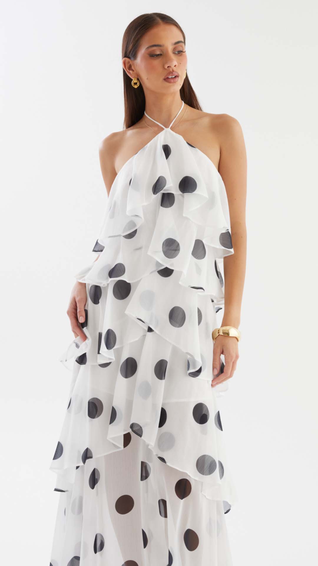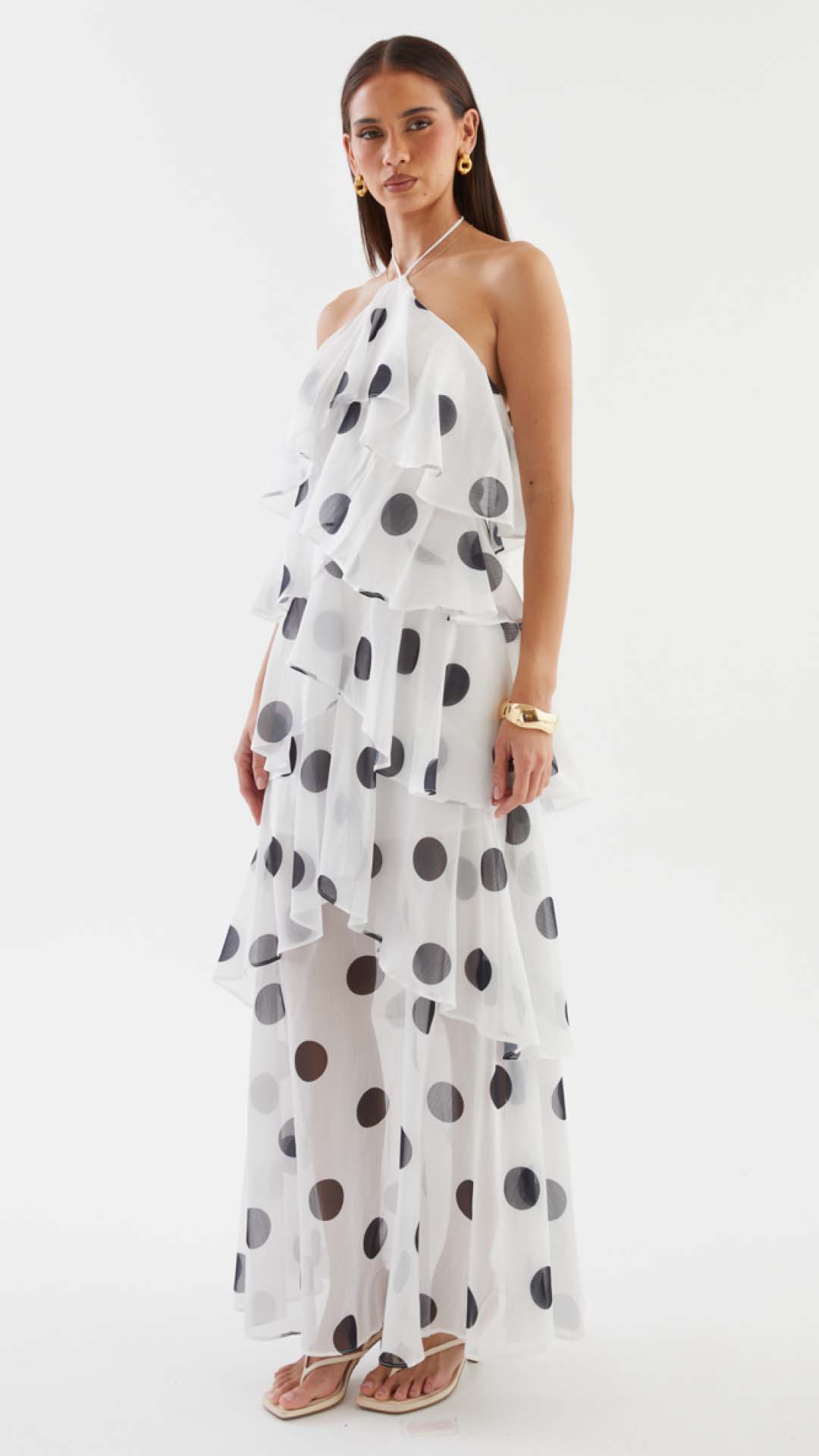 Cascading chiffon flounces engineer kinetic volume, animating the polka dot motif into a dynamic display of occasion-assured presence. Beneath the sheer maxi overlay, a partial lining secures coverage while allowing the legs to read through in motion.