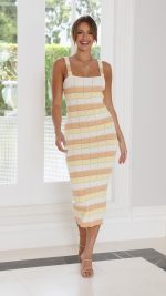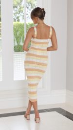Toperth Yellow Stripe Eyelet Knit Bodycon Midi Dress